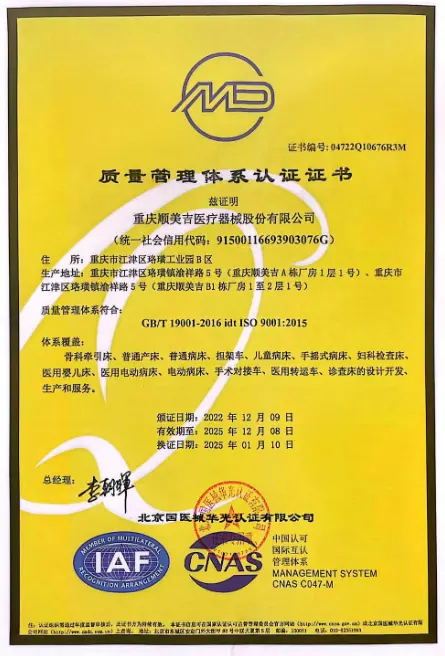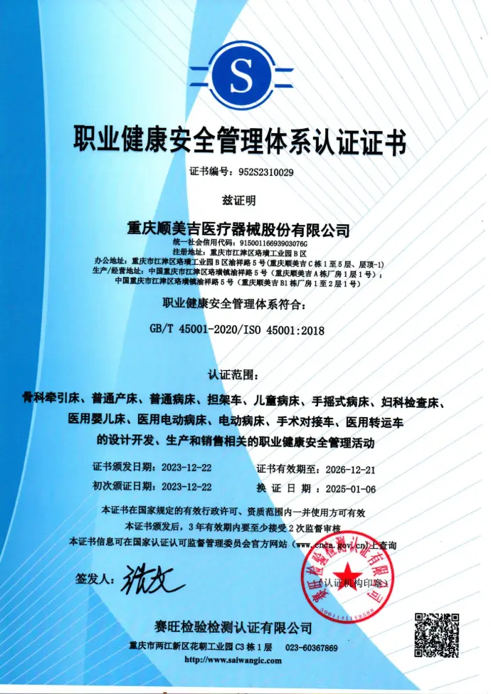 Chongqing Shunmeiji Medical Equipment Co., Ltd. is located in Luohuang Lingang Industrial Park, a national industrial park in Chongqing. The company is a medical device manufacturing enterprise that integrates design, development, manufacturing, and sales, with strong technical research and development and manufacturing capabilities. It is a national high-tech enterprise, a "specialized, refined, unique, and original" enterprise, a national quality leader in the medical device industry, a national quality and integrity benchmark enterprise, a vice president unit of the Chongqing Elderly Care Association, a director unit of the Chongqing Elderly Care Service Association's Elderly friendly Products and Technical Services Special Committee, a vice president unit of the Chongqing Private Economy Association, a key enterprise in the city's pharmaceutical industry, a vice president unit of the Jiangjin District Federation of Industry and Commerce, the District Charity Association, the Private Economy Association, and the Credit Enterprise Association, and a "contract abiding and credit worthy enterprise" in Jiangjin District. Its electric nursing bed series (two function, three function, five function, rotating bed) has been selected as one of the first batch of smart elderly care application pilot demonstrations and product promotion catalogs in Chongqing in 2024.